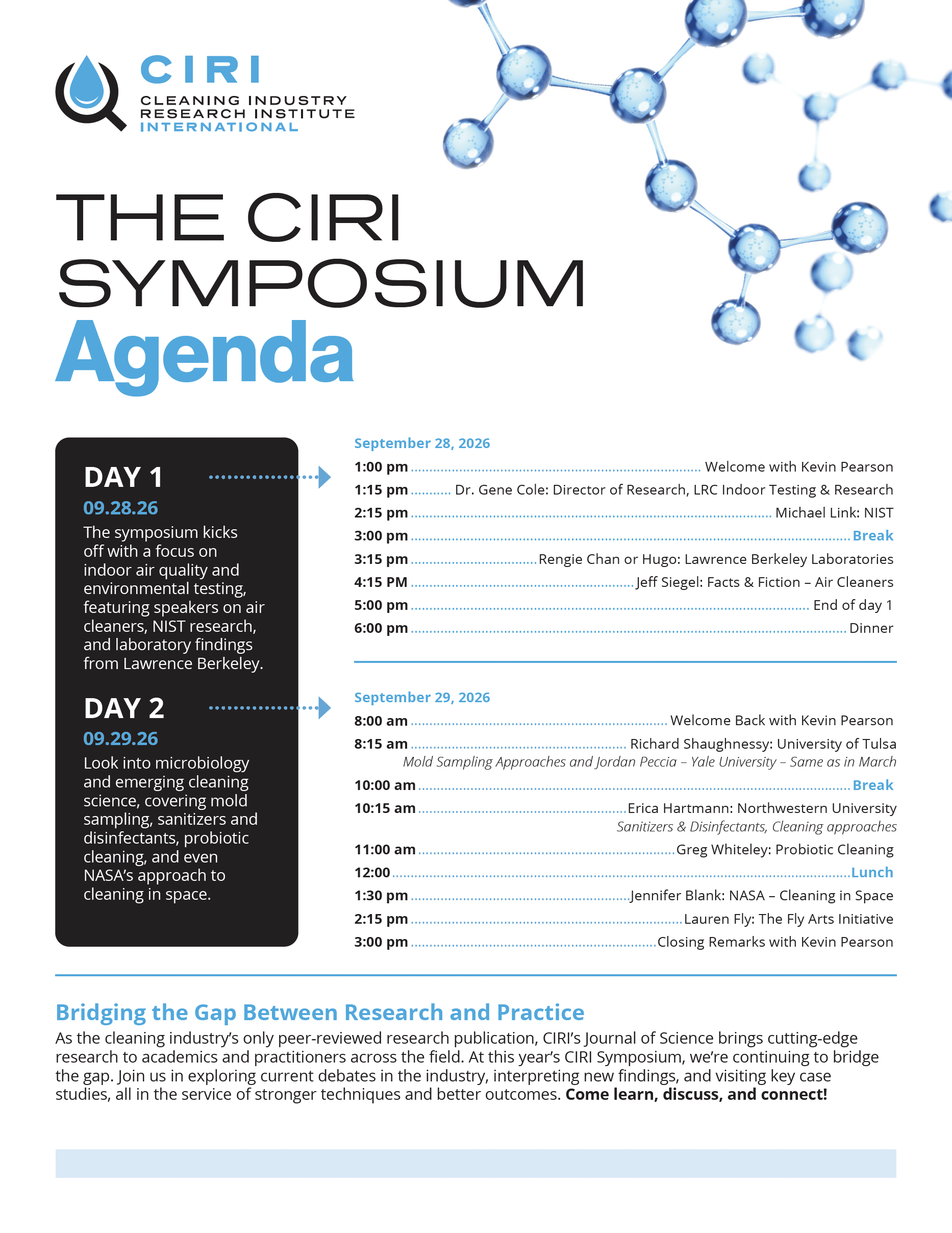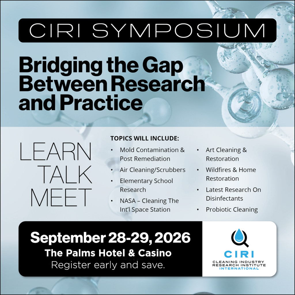 The CIRI Symposium is a newly adopted event designed to bring science to the forefront of the cleaning, inspection, and restoration professions. As a first-annual gathering, it will unite researchers, industry leaders, and field professionals to explore evidence-based advancements, emerging studies, and measurable best practices that support healthier indoor environments and improved cleaning outcomes. The symposium will feature expert presentations, meaningful discussion, and collaborative insight focused on strengthening the connection between real-world application and the research that drives the industry forward.